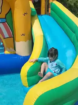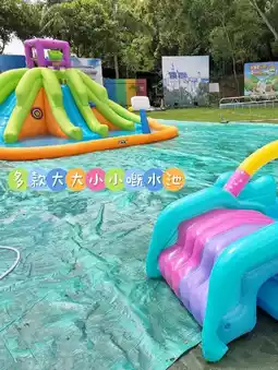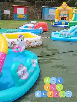 There are large and small inflatable pools in the play area.