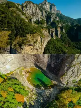 When you walk to the innermost part, you can see the Dalongqiu Waterfall. The waterfall flows down from the 197-meter-high Lianyunzhang cliff. It is said that the scenery and posture of Dalongqiu change from time to time with the changes of seasons, wind speed, and whether it is sunny or rainy.