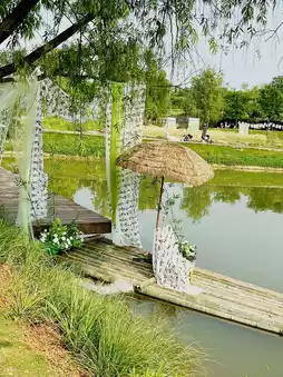 There are many interesting and beautiful attractions in Dongting Lake Town. The side near the parking lot looks like a fairy tale world, with colorful wooden doors and small windmills. There are also decorations under the big trees. It is very artistic to take pictures here.