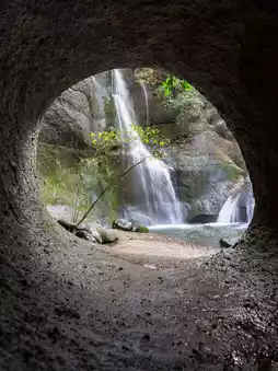 There are various ways to enjoy it, such as climbing a nearby rock to get a closer look at the waterfall, or taking a photo with the gaping tunnel in it.