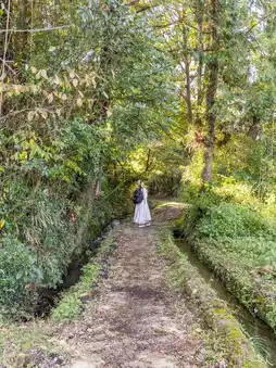 After passing through the roadside and the natural rural scenery with sunlight filtering through the trees,