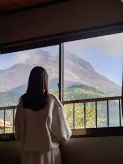 but when I woke up in the morning, I was thrilled to see the beautiful, splendid Mount Yufu standing tall from the window...!
