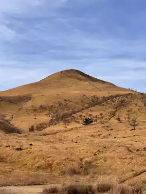 Yufuin's iconic mountain, with golden silver grass swaying in the breeze.