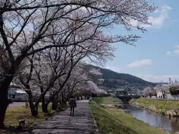 For travel enthusiasts, Yufuin is a must-visit town if you're heading to Fukuoka. But let me tell you, visiting Yufuin during cherry blossom season is ten times more beautiful. Being a town nestled in the mountains, the backdrop is surrounded by mountains in every direction. With the Oita River flowing through, you get to enjoy a view of mountains, rivers, and cherry blossoms all at once—a perfect artistic composition. As for transportation, we traveled by bus from Tenjin-Minami Station, booking a Nishitetsu bus. It's a direct bus ride without needing to change lines, arriving at Yufuin Station in about two and a half hours. The fare is 3,250 yen. I recommend coming early in the morning, walking from the station to take photos of cherry blossoms along the river, and then strolling along the riverside all the way to Kinrin Lake.