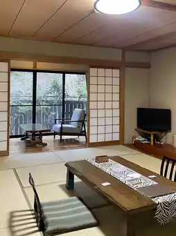 The room type booked this time is a separate room (Japanese style room + open-air bath) with a private open-air hot spring, the room style is Japanese traditional style, the living room will become a bedroom in the evening, the staff will lay tatami mats while we have dinner. The private hot springs are not very large, with a Japanese-style garden next to it
