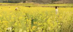 With high mountains as a backdrop and a wide river surface, the lush rapeseed fields, along with egrets and ducks, create a typical idyllic landscape.