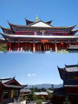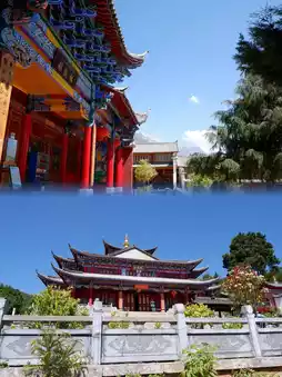 The Fuguo Temple has a cross-shaped layout, with three bays in width, and its main building is the Wufeng Tower, facing the Jade Dragon Snow Mountain. Vegetarian meals are available at noon.