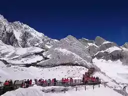 The sacred mountain and settlement of the Naxi people in Yunnan, often shrouded in mist halfway up, with undulating mountain ranges, looks like a giant silver dragon from a distance, hence the name 'Jade Dragon Snow Mountain.' It is a must-visit attraction in Lijiang.