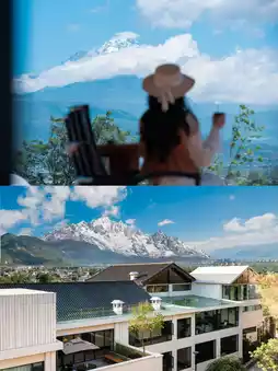 Open the window, and there’s Jade Dragon Snow Mountain! The room features a 180° floor-to-ceiling window, so you can lie in bed and watch the golden sunrise 🌅. No need to wake up early to rush to attractions (the hotel even provides transportation to the ancient town). You can sleep in and still enjoy the view. There’s also a dedicated viewing platform for a different perspective. The bathroom is equipped with a soaking tub and a scenic window (don’t worry about privacy), allowing you to soak while admiring the snow-capped mountain 👍.