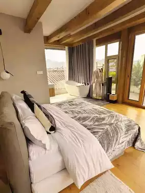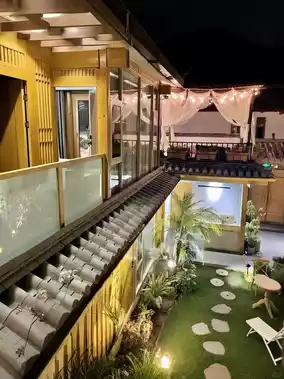 The floor-to-ceiling windows and terrace are very beautiful. The courtyard is exquisitely decorated with flowers and plants, and there are three adorable cats, probably Maine Coons. I didn’t even want to leave the terrace; just enjoying the courtyard scenery was enough. The owner is very enthusiastic, offering welcome fruits, desserts, and shuttle services.
