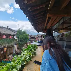 After some exploring, I settled into a cozy café overlooking the rooftops and ordered a handcrafted pour-over coffee and an espresso. The view of Jade Dragon Snow Mountain from the window was surreal — jagged peaks cutting into the sky, partially wrapped in clouds. Time seemed to slow down with every sip.