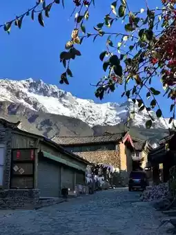 It's “at the foot” of the Jade Dragon Snow Mountain (Yulong Snow Mountain), so you get spectacular mountain views.