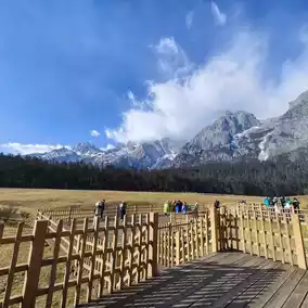 Yunshanping Mountain is situated at an altitude of 3,500 meters above sea level. It is one of the best spots to view the Jade Dragon Snow Mountain. Visitors need to purchase a cable car ticket from the base, which is sold together with a bus ticket. After taking the cable car, you will need to walk a bit further to reach this flat area. In December, the wind can be quite strong, and the weather is cold, so don't forget to bring protective gear. This is one of the highlights of the Jade Dragon Snow Mountain that you shouldn't miss.