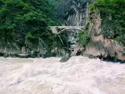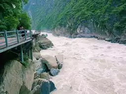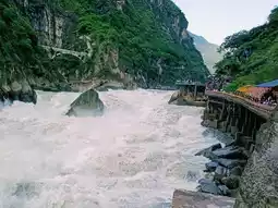 The upper section of the gorge is the most famous, featuring the iconic "Tiger Leaping Stone." This massive boulder sits mid-river, where roaring waters crash against it with tremendous force. Visitors can stand on viewing platforms to witness the river’s raw power, as whitewater surges through the narrow passage. The sound of the rushing water echoes off the cliffs, creating an unforgettable sensory experience.