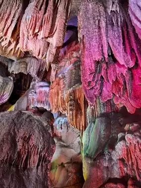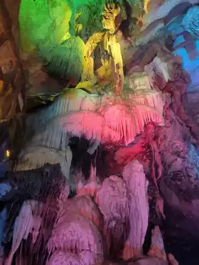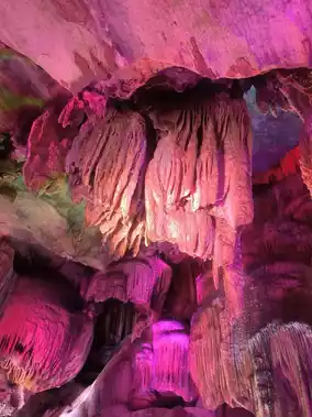 When you step into Panlong Cave, it's like entering a dreamlike underground world. The cave is filled with stalagmites and stone pillars of various shapes. Some resemble towering mountains🏔️, rising from the ground and reaching the cave ceiling, while others look like lively little animals🐇, seemingly jumping and playing among the rocks. The layers of stone drapes resemble luxurious stage curtains, shimmering with mysterious light under the illumination. The stone flowers, like stars, bloom on the cave walls, delicate and intricate, each one crafted with nature's finest artistry, leaving you in awe of nature's craftsmanship.😃