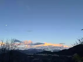 This photo captures the famous "Golden Mountain" phenomenon in Yunnan 🌄, where the snow-capped peaks glow with golden hues under the morning or evening sunlight⛰️, exuding grandeur. In the distance, misty clouds 🌥️ add a touch of mystery. The foreground features tree branches 🌳 and a village 🏡, creating a harmonious blend of nature and culture 🌺 that is truly breathtaking!