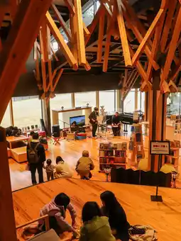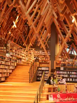 A library designed by Kengo Kuma. A unique and eye-catching building made from wood from Yusuhara, it is a place of relaxation for locals. There are many ways to take off your shoes and relax.