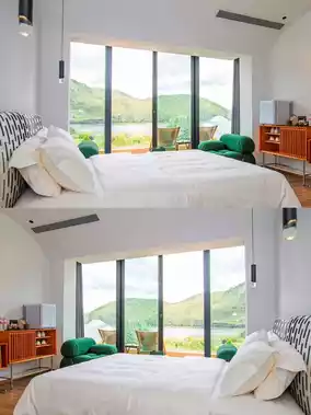 The rooms are incredibly cozy, with floor-to-ceiling windows framing unobstructed lake views. Lying in bed, you'll feel the gentle breeze and hear the rhythmic lapping of waves against the shore, as if perfectly harmonized with nature.