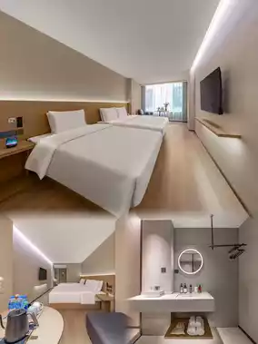 The hotel is located at 47 Fuxin Road, Fenghuang Subdistrict, a 10-minute walk from the high-speed rail station. 🚗 There's no bustling commercial area nearby, and it's mostly an old neighborhood populated by locals. Snack shops and fruit stalls are just a short walk away. During an evening stroll, you can smell the aroma of cooking 🍲, which gives you a strange sense of homecoming.