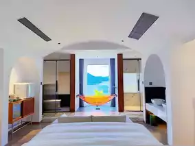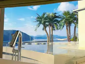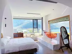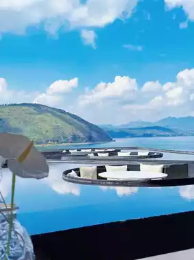 The entire Fuxian Lake spreads out beyond the floor-to-ceiling window, water and sky blending into one, shimmering like a breathing painting.