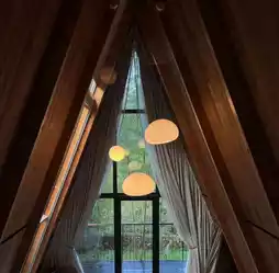 I stayed in the popular room type, the triangular tree house, which is very spacious inside. The big bed is directly opposite the floor-to-ceiling windows, and outside the window is a large red maple forest. The beautiful scenery of the distant mountains and the near forest is unobstructed. The roof of the room is designed with a high space, and the top is equipped with a sloping roof skylight. The warm tone of the ceiling lamp adds a warm atmosphere to the green interior.
