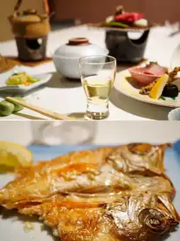 Full of fresh seafood, including firm sashimi, grilled abalone, shabu-shabu red snapper, earthenware pot with maitake mushrooms, and grilled local beef on a hoba leaf!