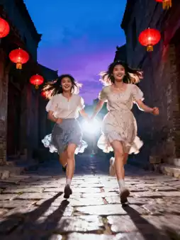 We chose a "corner spot" in the middle of the old street for our photos: my bestie stood on the stone path with her back to the lanterns, while I held the phone (flash on) about 1 meter away and took a slightly upward shot. The flash perfectly illuminated her face, making her skin glow without looking oily. The background featured warm yellow lanterns and a blue-purple sky, creating a stunning contrast. Even the pearl hair clip in her hair sparkled softly.