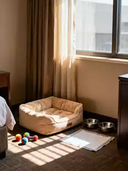 The "pet corner" in the room was a delightful surprise: a beige pet bed by the window (with a soft fleece cushion, even cozier than the one at home), stainless steel food and water bowls (sanitized and gleaming), and a small toy ball. No need to rummage through my luggage—my corgi immediately jumped onto the bed, happily chewing the ball, showing no signs of stress from the new environment.