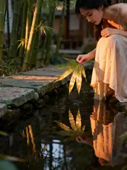 An 8-minute walk leads to Bamboo Creek Courtyard (free entry), where slender bamboo surrounds a shallow creek, and their shadows ripple on the water. The best time to shoot is 5 PM, when the setting sun bathes the bamboo leaves in a soft golden hue, and the creek reflects subtle light. Stand on the creekside stone slabs, letting your dress hem touch the water. Hold a large bamboo leaf and gaze at your reflection while a friend crouches to take slightly upward shots. Bamboo shadows on your chest and the interplay of water and human reflections create a watercolor-like effect, with even water droplets on your dress hem appearing vividly.