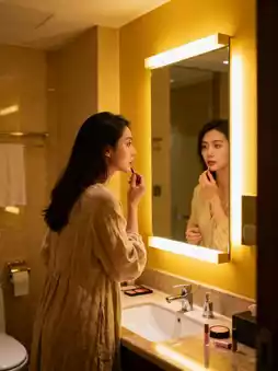 Unlike the usual chaos of getting ready in a hotel room, this hotel ensures you’re photo-ready. The bathroom features a 1.6-meter warm-lit full-length mirror, perfect for creating a subtle Zen-inspired makeup look: light brown brow powder, soft pink blush, and nude pink lip gloss for a natural glow that complements the bamboo shadows.