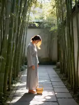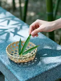 For close-ups, sit on a gray stone bench with a bamboo basket on your lap. Place a couple of bamboo leaves in the basket and use a phone with a wide aperture to blur the background, focusing on your hand holding the leaves. Even the tiny leaf fragments in your nails will appear sharp, adding intricate detail to the Zen aesthetic.