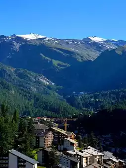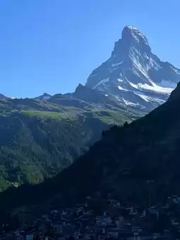 A short walk uphill from the center of Zermatt village brings you to the Matterhorn Viewpoint, the perfect spot to see the Matterhorn head-on. The path up the slope of this high-altitude village, over 1,600 meters above sea level, is short but a bit steep. However, upon arrival, you are greeted with a breathtaking view that makes it all worthwhile. Right before your eyes, the massive triangular peak of the Matterhorn rises sharply into the sky, while below, the quiet Zermatt village with its wooden rooftops stretches out serenely.