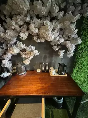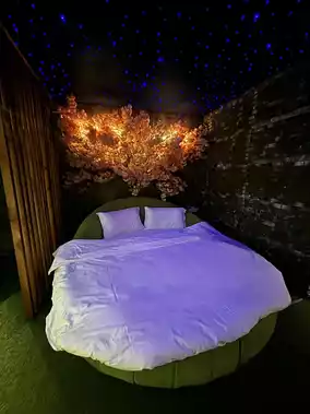 This room type is mainly green, with green carpet flooring and a starry sky ceiling. The room includes a bathtub, cradle, mineral water, and tea bags. It has windows and a spacious layout. The hotel offers free parking. Nearby, there are breakfast shops, KFC, Starbucks, Luckin Coffee, and it is close to a shopping street.
