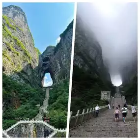 Morning: Take Tianmen Mountain Cableway up, walk the Glass Walkway and Ghost Valley Walkway, climb Tianmen Cave.