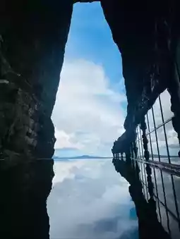 It's not a traditional cave that you walk into horizontally—it's a vertical slit or a gaping hole that pierces through the mountain, creating a surreal visual against the sky.