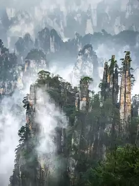 Famous for its sandstone peak forest landscape, with thousands of towering peaks shrouded in mist, creating a fairyland-like atmosphere.