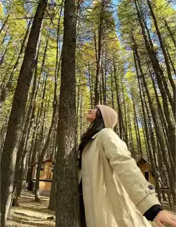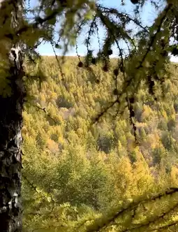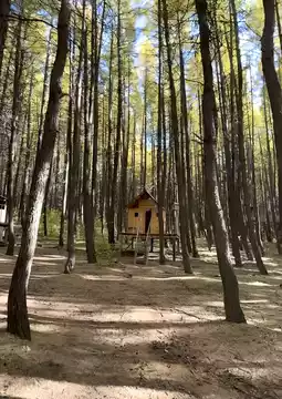 Seeing the yellow-green gradual transition of the pine needles, the rich colors are like fake, the red leaves encountered in the forest, the small cabin, just look up to see the blue sky and the warm sunshine on the mountain top