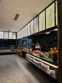Afternoon sunlight streams through the floor-to-ceiling windows into the room, where natural wood furniture and elements create a warm atmosphere. Nestle into the sofa with a good book, or sit around chatting with family and friends, with layers of greenery and occasional birds flying outside the window. At dusk, you can take a walk along the hotel’s exclusive mountain path, watching the sunset drape the mountains in golden light, capturing your own unique mountain romance.