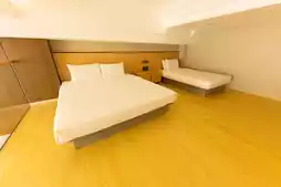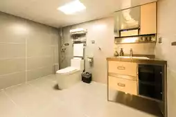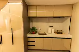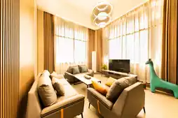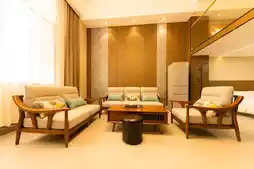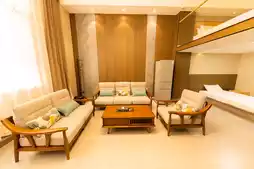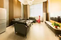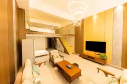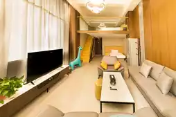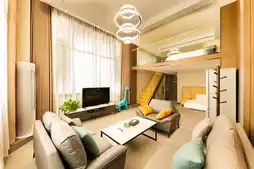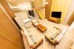 The main room type is a loft duplex. The lower level features a spacious living room, while the upper level houses a private bedroom. Each room is equipped with a Xiaomi TV, air conditioning, and a private bathroom. The minibar includes teacups and complimentary tea, making it perfect for families or friends traveling together.