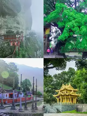 A hanging ancient temple is hidden in the deep mountains at an altitude of 1287 meters, surrounded by clouds and mist, with flowing springs and waterfalls.