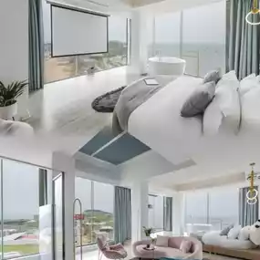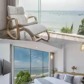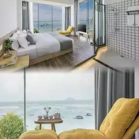 The room decor is super stylish, with fluffy bedding and 180° floor-to-ceiling windows offering ocean views—amazing! 🎬