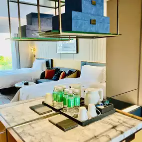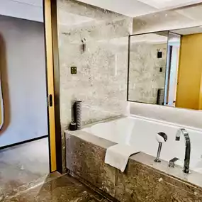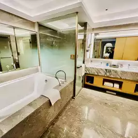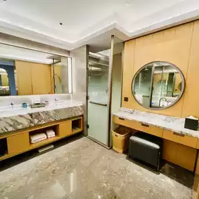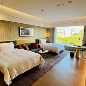 The hotel rooms are also very good, designed to follow the Chinese modern fashion route, the room area is about 55 square meters, a strong sense of space, spacious and comfortable, fully transparent panoramic glass windows, lying down can have the beautiful scenery of Seven Star Rock. The mattress softness and support are just right, the bedding is also comfortable, the bathroom space separated from dry and wet, the ingenious design of the marble bathroom, very clean and hygienic.