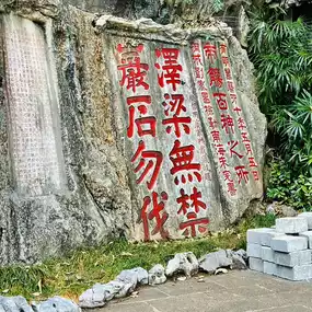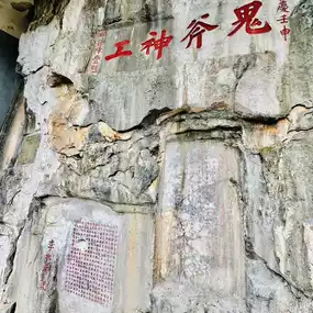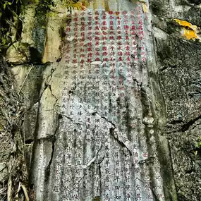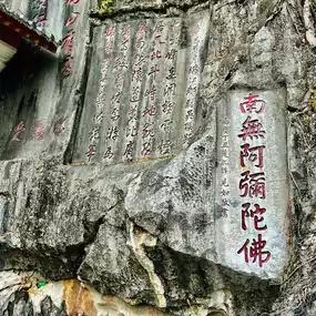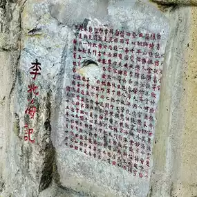 The Qixingyan Cliff Carvings are mainly in Chinese, but there are also some Tibetan and Spanish. The Chinese characters include seal, official, regular, running and cursive scripts. The largest ones are as big as Wenyu and the smallest ones are half an inch. Many masterpieces of famous calligraphers are gathered together to form a unique treasure house of calligraphy art in the south.