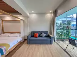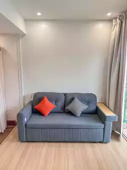 The room is very big, with a big bed, sofa, and projector