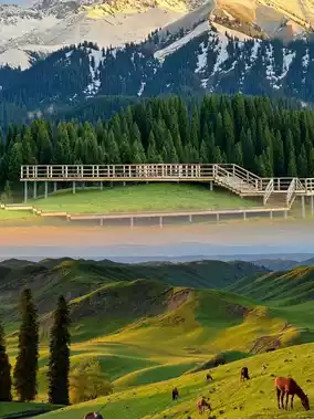 Visiting Yili after April is simply a divine level of beauty! The ice and snow melt away, the grass and spruce are dripping with greenery😀, passing through snow-capped mountains, steep ridges, and meadows, you can also see the adorable flocks of sheep🐏. The little houses on the green slopes and the clouds in the sky☁ make you feel like you're in a fairy tale world.
