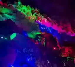 Upon reaching the ancient trail post, there are amusement facilities (aerial spaceship, zip line, etc.), and at 12:30 there is a performance, including an aerial bicycle and tightrope walking. For descending the mountain, you can choose the glass slide for 30 yuan per person (about 3-5 minutes), or after walking a distance, take the children for a small train ride down the mountain (about 8 minutes). The train ride features short segments from the Spring and Autumn Warring States period, which are quite interesting and enjoyable. The train goes directly to the foot of the mountain. Before climbing the mountain towards the cave entrance (about 15 minutes), it is relatively more tiring to climb the stairs due to the uneven heights and the slight slipperiness after the rain (remember to be safe). The scenery inside the cave is beautiful, with stalactites in various shapes and the lighting design adds a colorful and dazzling effect.