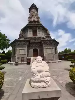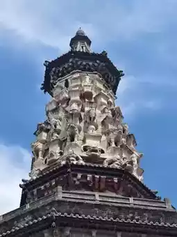 The Hua Pagoda of Guanghui Temple, also known as the Flower Pagoda or Multitreasure Pagoda, is located on Minsheng Street within Zhengding County. It was built during the Tang Zhenyuan period (AD 785—805) and has a history of over 1100 years. The pagoda is 40.5 meters high, with a unique shape and structure. The Hua Pagoda has a brick and mortar structure, with the first level of the pagoda body having an octagonal plan. On the four main sides, there are additional flat hexagonal pavilion-like single-layer annexes, commonly known as small pagodas, hence the name Multitreasure Pagoda. There are round arched doors on each main side and outside the annexes. The configuration of the bucket arches is peculiar. The second level of the pagoda body is octagonal, with three bays on each side, a flat base below, and bucket arches and eaves tiles above. The central bay on each side is a door, with false lattice windows and long rectangular pointed brick niches on the sides. The third level has a very large base, but the pagoda body suddenly becomes smaller. There are square doors and false windows on all four sides. Above the third level, the octagonal base is supported by strongmen, and the pagoda body is conical, with colorful sculptures of tigers, leopards, lions, dragons, and Buddha figures in relief around it. Above is an octagonal eave top, with a pagoda spire on top, which is now damaged. The Hua Pagoda has a unique shape, with a structure that varies from level to level, reflecting the architectural techniques of the Tang Dynasty in China.