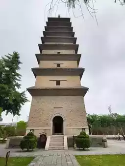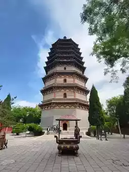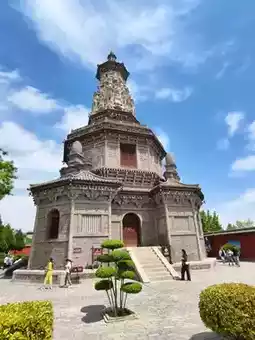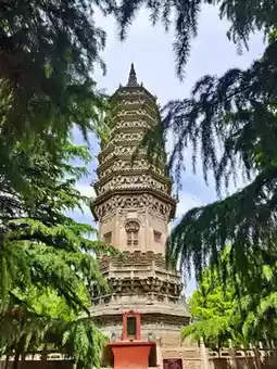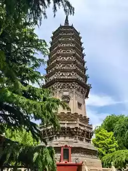 The Chengling Pagoda is located in the southeast corner of Zhengding City, within the Linji Temple, also known as the Green Pagoda. It was built in the eighth year of Tang Xiantong (867). This pagoda has a story: during the Tang Dynasty, the monk Yixuan founded the Linji school of Buddhism in Zhengding, which became one of the important sects of Buddhism in China and was later introduced to Japan during the Song Dynasty. Yixuan passed away in the seventh year of Tang Xiantong (866), and the following year, Buddhists chose a location in the southeast of Zhengding City to build a pagoda for his burial. Thus, the Linji Temple was moved here. The temple was destroyed early on, but the Green Pagoda was rebuilt during the Jin Dading period. It is still considered the birthplace of the Linji school, with many followers. The Green Pagoda is 33 meters high, with nine levels, and the pagoda body is made of brick, in an octagonal shape. In recent years, friends from the Japanese Buddhist community often visit this pagoda for pilgrimage.
