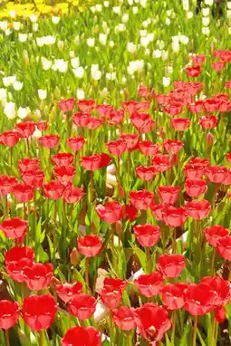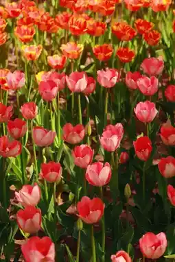 The tulips are mostly in full bloom, with some buds waiting to open. Near the cardboard windmill, there are currently many tulips in a variety of colors, including purple, pink, red, and yellow. Although they are not yet in full bloom, the colors are unique and beautiful under the light.