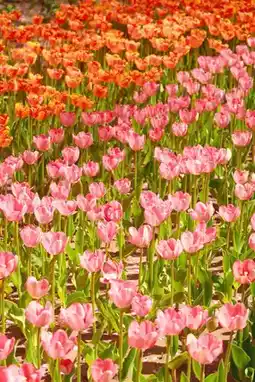 You'll walk through a cherry blossom grove, with tulips planted around the trees, so you can enjoy both kinds of flowers. Some tulips are still in bud, and the cherry blossoms by the river are also blooming nicely.